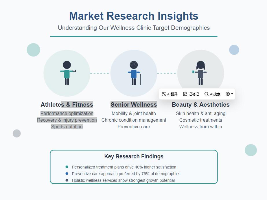 • Find Your Niche: A common mistake for wellness entrepreneurs is trying to appeal to everyone. Therefore, instead of casting a wide net, you should work to identify a gap in the market. Perhaps no one is targeting athletes for muscle recovery or offering premium anti-aging packages.